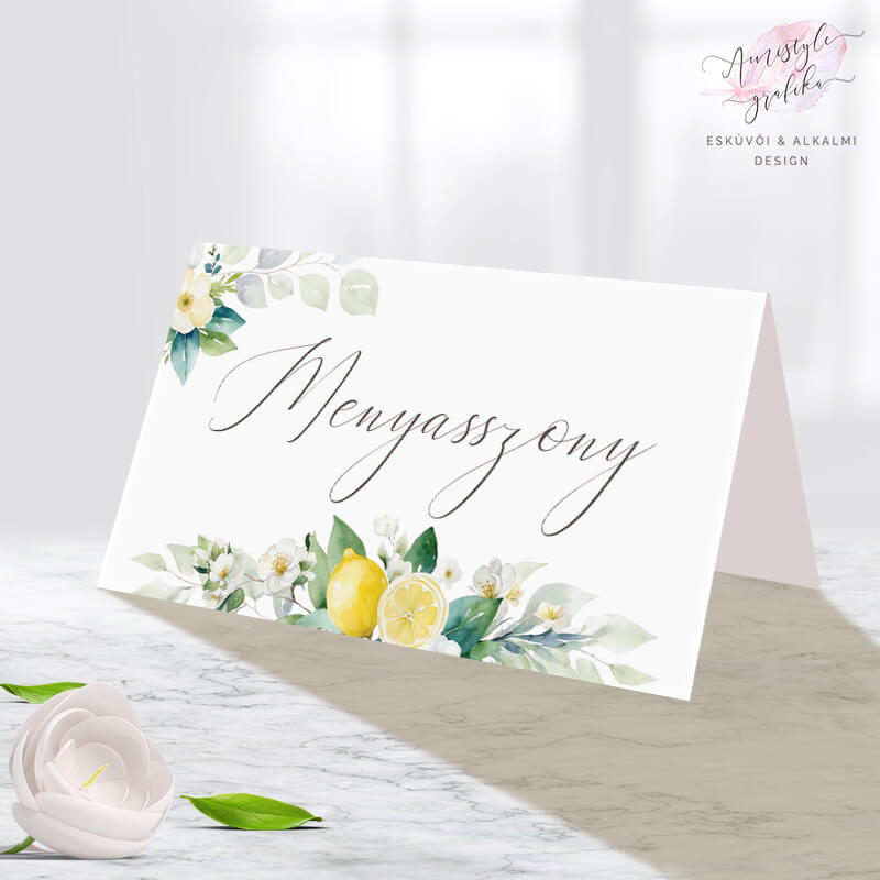 A frissítő citromsárga és olajzöld árnyalatokkal megálmodott Amalfi Lemon ültetőkártya igazi mediterrán hangulatot varázsol az esküvői asztalokra. Az akvarell stílusban készült citromok, virágok és zöld levelek tökéletesen kiegészítik az esküvő természetközeli vagy olasz tematikáját.