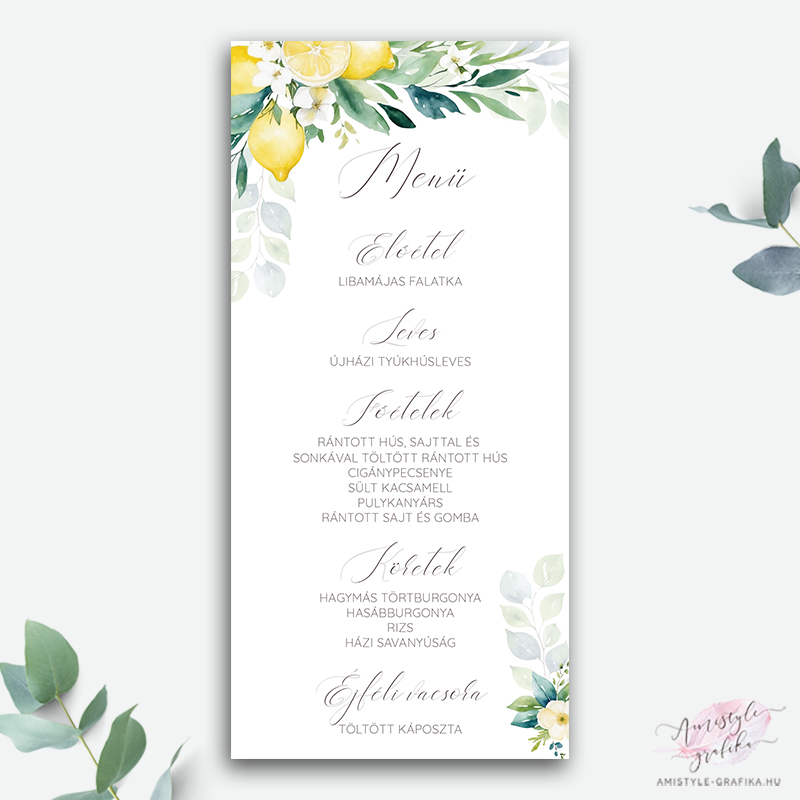 Amalfi Lemon Vízfestékes Kétoldalas Esküvői Menü és Itallap