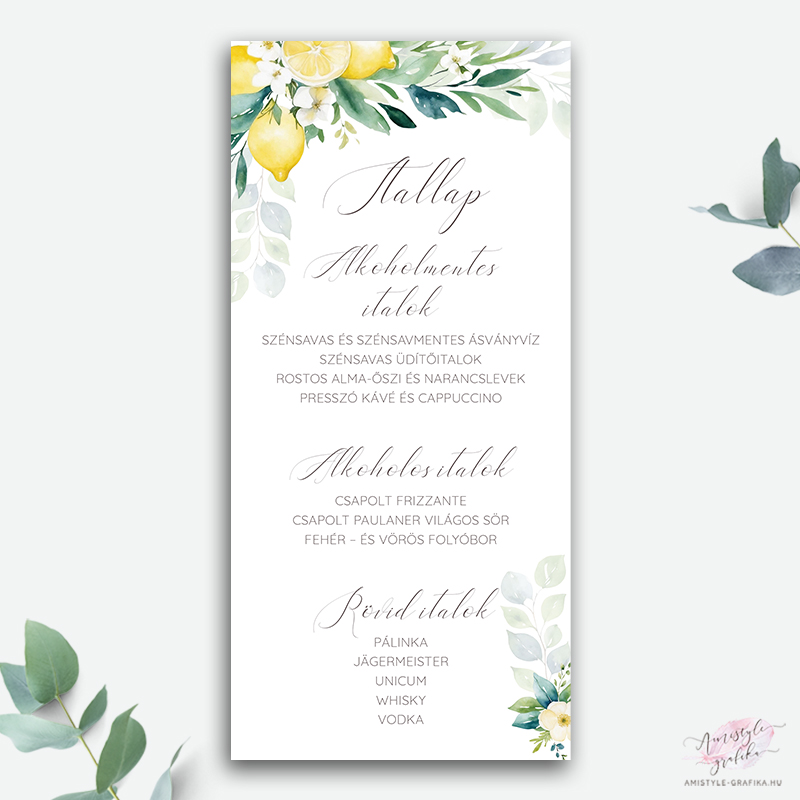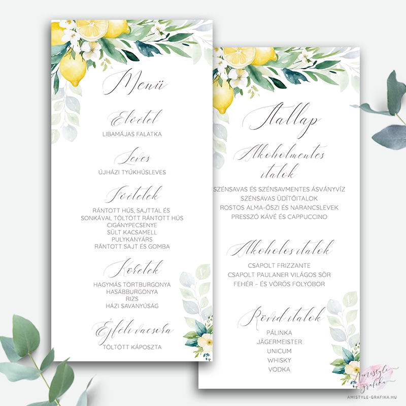 Az Amalfi Lemon kollekció kétoldalas menü- és itallapja igazi mediterrán hangulatot varázsol az esküvői asztalokra. A különleges citromos-virágos akvarellgrafika az olasz tengerpart frissességét idézi meg, így ideális választás nyári, szabadtéri vagy természetközeli esküvőkhöz.